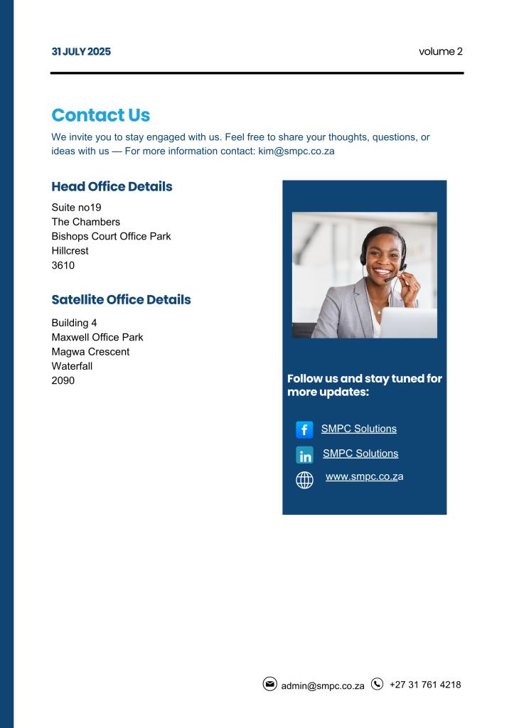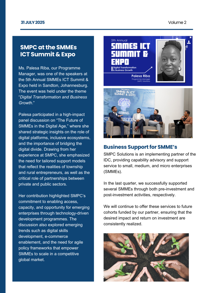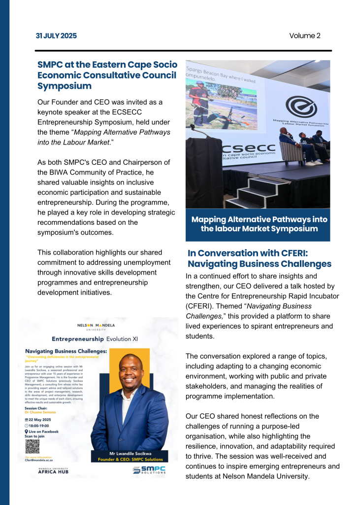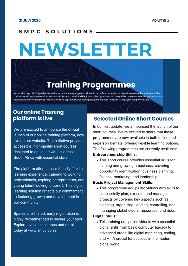 SMPC Solutions is a 100% Black-owned consultancy offering innovative solutions in project management, business advisory, enterprise development, and skills training. We help businesses grow sustainably while contributing to South Africa's economic transformation
